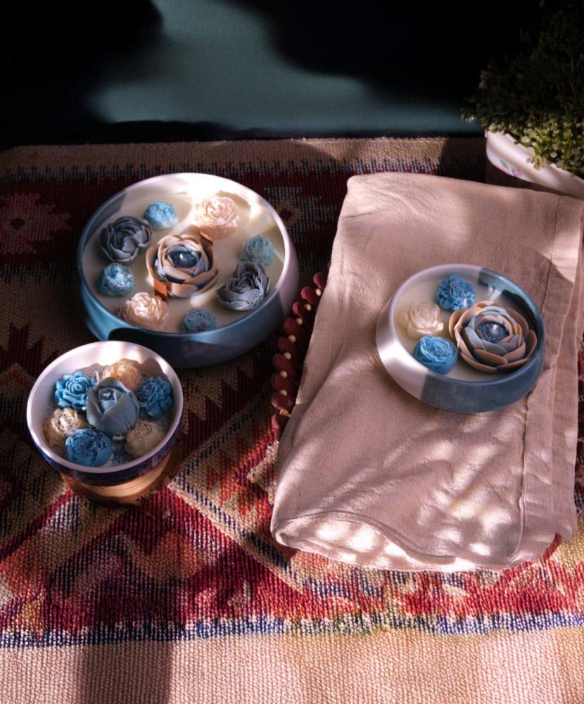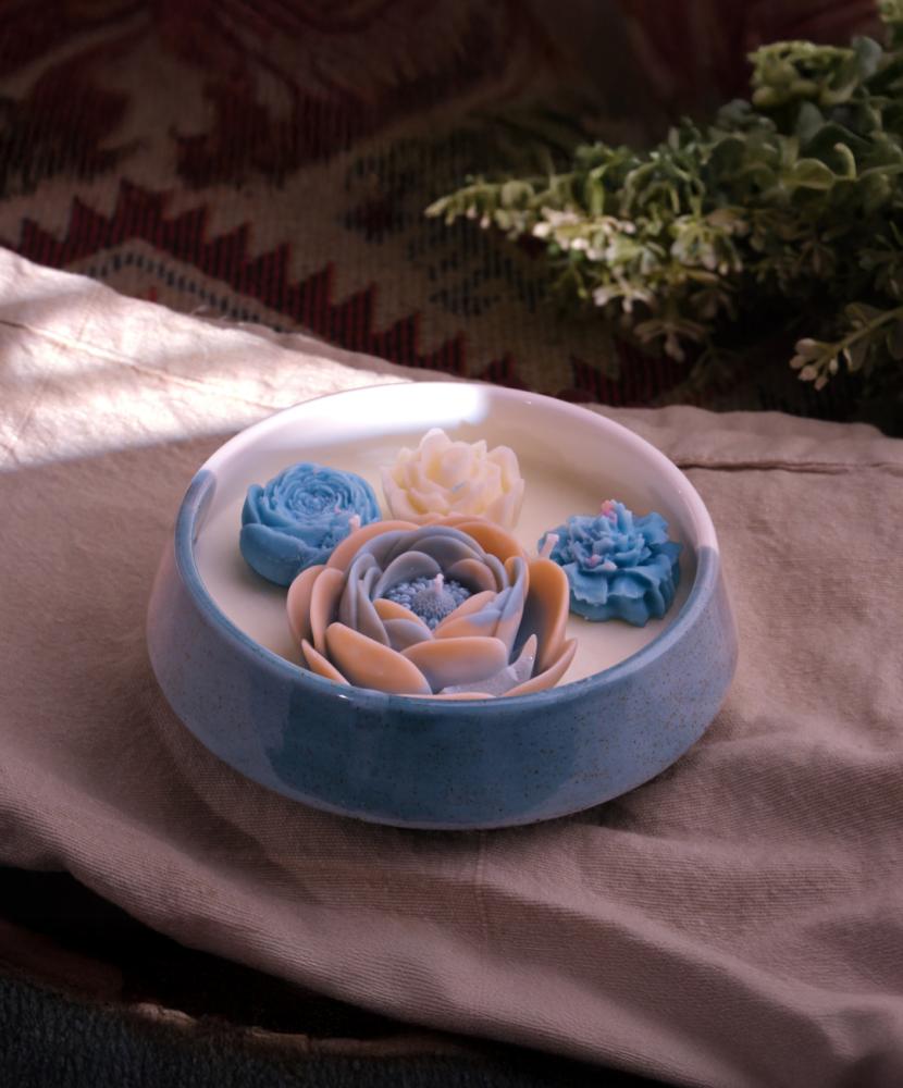 شموع مُشكّلة بعناية على هيئة زهور فنية، داخل وعاء سيراميكي أنيق بتدرجات الأزرق الهادئة. مناسب للزينة، الهدايا، وجلسات الاسترخاء.