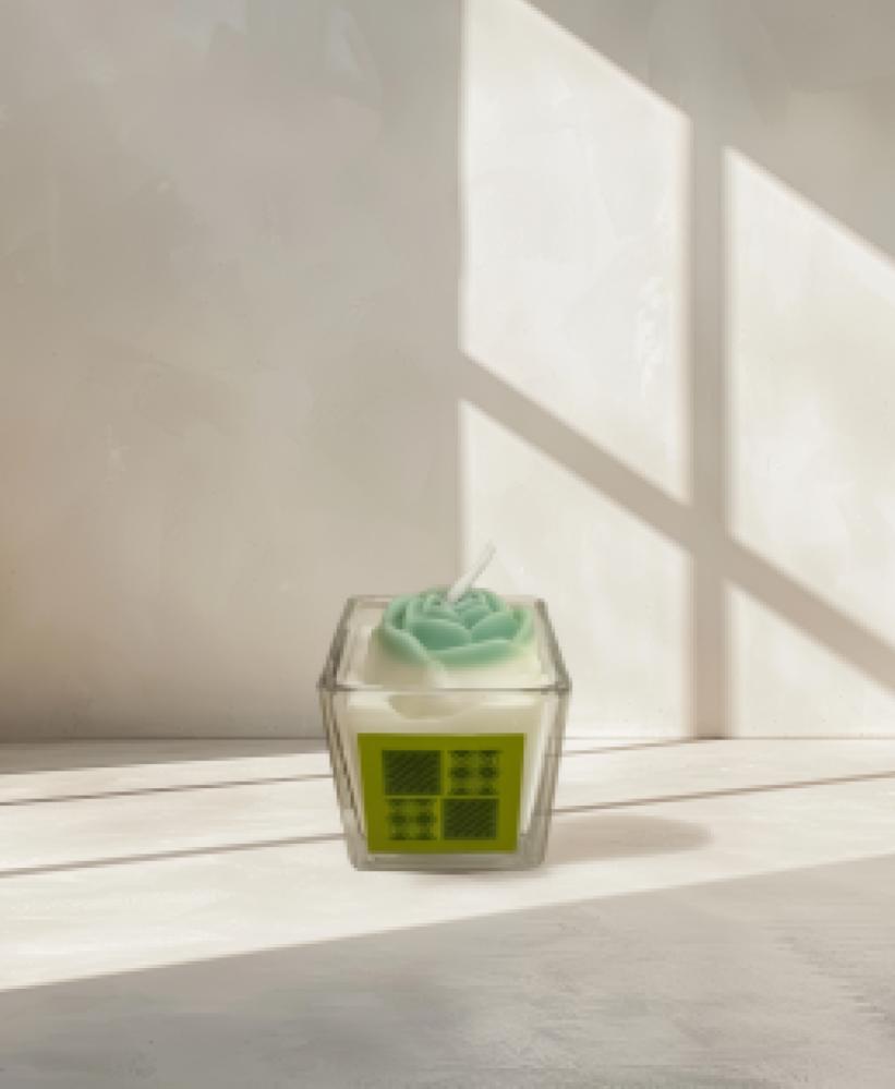 شمعة مصبوبة يدويًا بعناية، في إناء زجاجي أنيق، مزينة بلاصقات بزخارف سدو خضراء تعكس هويتنا الثقافية الغنية.