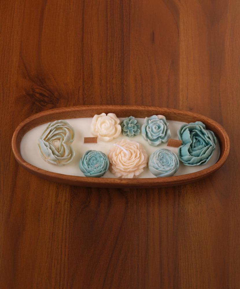 قطعة فنية تنبض بالرقي، مصبوبة يدويًا داخل صحن خشبي أنيق ومزينة بورود شمعية بتفاصيل ناعمة وكأنها حقيقية.